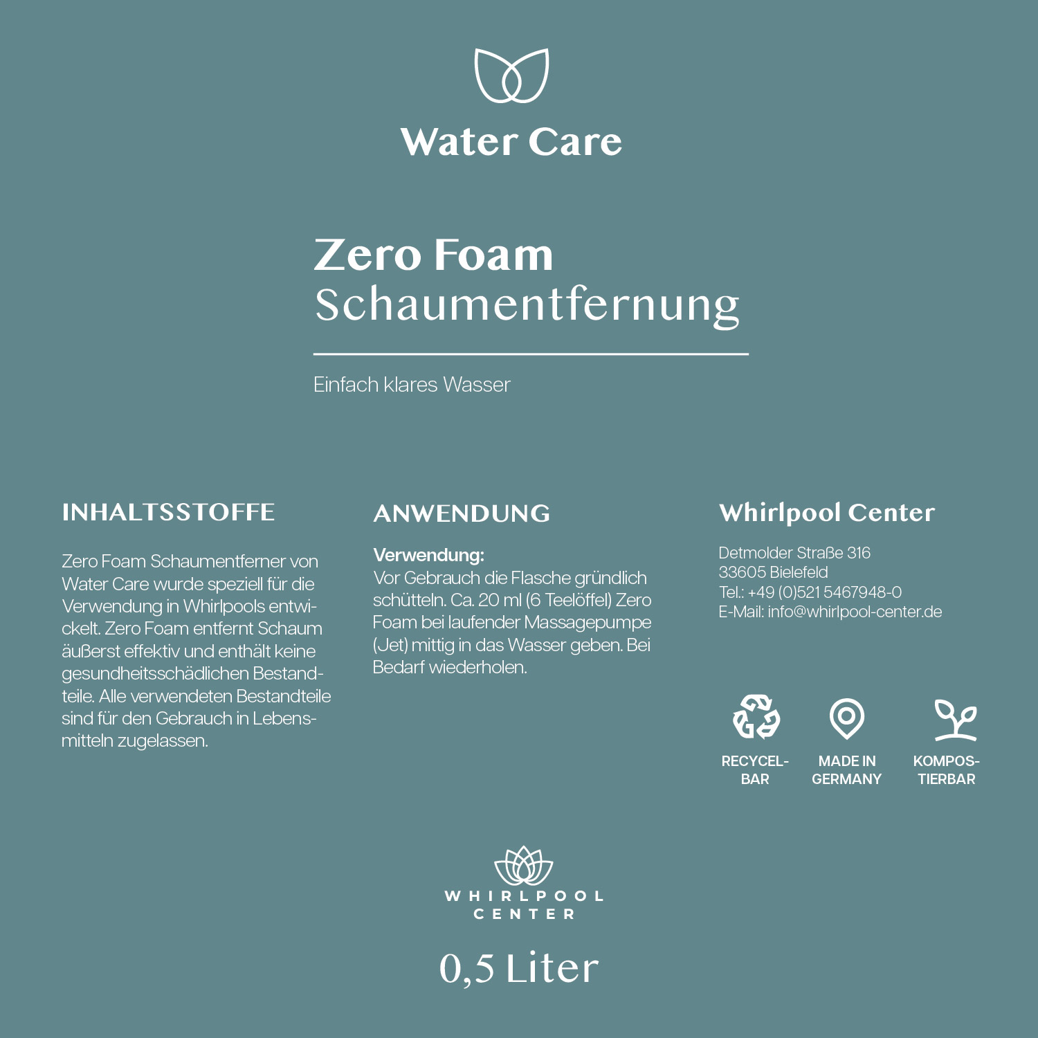 Zero Foam Schaumentferner von Whirlpool Center watercare wurde speziell für die Verwendung in Whirlpools und Swim Spas entwickelt. Zero Foam entfernt Schaum äußerst effektiv und enthält keine gesundheitsschädlichen Bestandteile. Alle verwendeten Bestandteile sind für den Gebrauch in Lebensmitteln zugelassen.